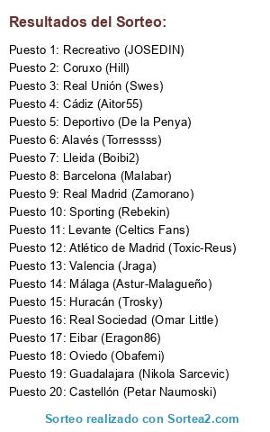 Lista de participantes: Oviedo (Obafemi), Cádiz (Aitor55), Málaga (Astur-Malagueño), Lleida (Boibi2), Levante (Celtics Fans), Deportivo (De la Penya), Eibar (Eragon86), Recreativo (JOSEDIN), Valencia (Jraga), Barcelona (Malabar), Guadalajara (Nikola Sarcevic), Real Sociedad (Omar Little), Castellón (Petar Naumoski), Sporting (Rebekin), Real Unión (Swes), Alavés (Torressss), Atlético de Madrid (Toxic-Reus), Huracán (Trosky), Real Madrid (Zamorano), Coruxo (Hill).