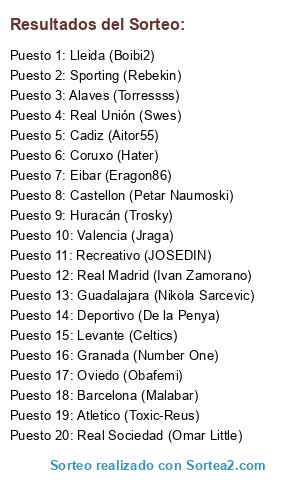 Lista de participantes: Alaves (Torressss), Atletico (Toxic-Reus), Barcelona (Malabar), Cadiz (Aitor55), Castellon (Petar Naumoski), Coruxo (Hater), Deportivo (De la Penya), Eibar (Eragon86), Granada (Number One), Guadalajara (Nikola Sarcevic), Huracán (Trosky), Levante (Celtics), Lleida (Boibi2), Oviedo (Obafemi), Real Madrid (Ivan Zamorano), Real Sociedad (Omar Little), Real Unión (Swes), Recreativo (JOSEDIN), Sporting (Rebekin), Valencia (Jraga).