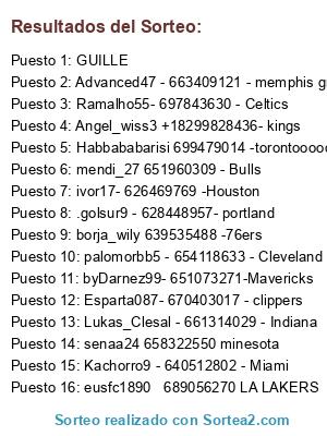 Lista de participantes: Esparta087- 670403017 - clippers, byDarnez99- 651073271-Mavericks, Ivor17- 626469769 -Houston, Lukas_Clesal - 661314029 - Indiana, Angel_wiss3 +18299828436- kings, mendi_27 651960309 - Bulls, eusfc1890 689056270 LA LAKERS, Habbababarisi 699479014 -torontoooooo, senaa24 658322550 minesota, borja_wily 639535488 -76ers, Ramalho55- 697843630 - Celtics, Kachorro9 - 640512802 - Miami, palomorbb5 - 654118633 - Cleveland Cavaliers, Advanced47 - 663409121 - memphis grizzlies, golsur9 - 628448957- portland, ssarlanga -674936586- bucks, Joui_Widow- 622709896-charlott hornet, omar043m- 622535089 - nets, sergiojr0998-679854966-Oklahoma, pepon1306.