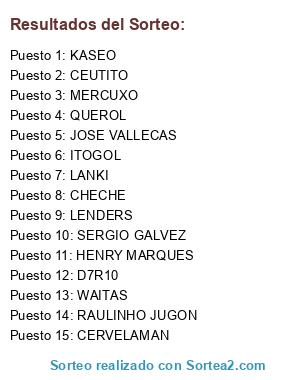 Lista de participantes: CERVELAMAN, CEUTITO, CHECHE, D7R10, HENRY MARQUES, ITOGOL, JOSE VALLECAS, KASEO, LANKI, LENDERS, MERCUXO, QUEROL, RAULINHO JUGON, SERGIO GALVEZ, WAITAS.