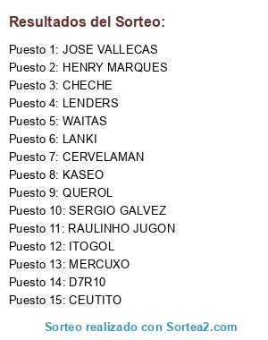 Lista de participantes: KASEO, CEUTITO, MERCUXO, QUEROL, JOSE VALLECAS, ITOGOL, LANKI, CHECHE, LENDERS, SERGIO GALVEZ, HENRY MARQUES, D7R10, WAITAS, RAULINHO JUGON, CERVELAMAN.