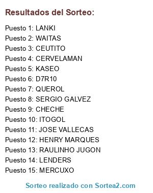 Lista de participantes: JOSE VALLECAS, HENRY MARQUES, CHECHE, LENDERS, WAITAS, LANKI, CERVELAMAN, KASEO, QUEROL, SERGIO GALVEZ, RAULINHO JUGON, ITOGOL, MERCUXO, D7R10, CEUTITO.
