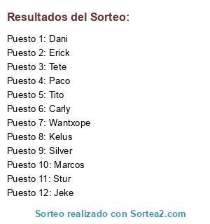 Lista de participantes: Tito, Carly, Dani, Erick, Jeke, Kelus, Marcos, Paco, Silver, Stur, Tete, Wantxope.