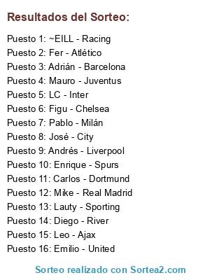 Lista de participantes: Andrés - Liverpool, Pablo - Milán, Enrique - Spurs, Leo - Ajax, Mike - Real Madrid, Mauro - Juventus, Lauty - Sporting, Diego - River, Adrián - Barcelona, Carlos - Dortmund, LC - Inter, Fer - Atlético, Figu - Chelsea, ~EILL - Racing, Emilio - United, José - City.
