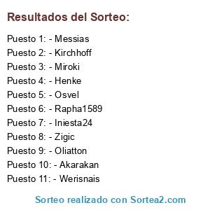 Lista de participantes: - Zigic, - Osvel, - Messias, - Kirchhoff, - Oliatton, - Akarakan, - Henke, - Miroki, - Rapha1589, - Iniesta24, - Werisnais.