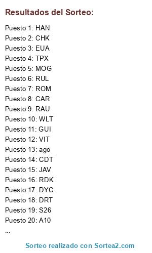 Lista de participantes: DYC, TPX, VIT, RDK, AIT, SMU, RUL, JAV, A10, BTO, CUR, SES, TIW, ALC, CDT, ZAM, CHK, S26, EVR, CAR, DRT, ago, ROM, HAN, MOG, RAU, ASI, JLO, JCB, WLT, EUA, GUI.