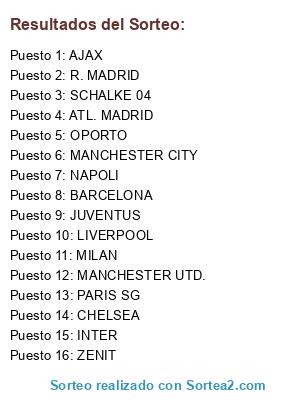 Lista de participantes: MANCHESTER CITY, NAPOLI, OPORTO, ATL. MADRID, CHELSEA, PARIS SG, MILAN, JUVENTUS, BARCELONA, SCHALKE 04, R. MADRID, MANCHESTER UTD., ZENIT, INTER, AJAX, LIVERPOOL.