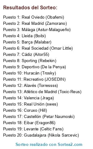 Lista de participantes: Valencia (Jraga), Eibar (Eragon86), Levante (Celtic Fans), Real Madrid (Zamorano), Barça (Malabar), Alavés (Torressss), Coruxo (Hill), Lleida (Boibi), Cádiz (Aitor55), Sporting (Rebekin), Real Unión (swes), Real Oviedo (Obafemi), Castellón (Petar Naumoski), Guadalajara (Nikola Sarcevic), Huracán (Trosky), Atlético de Madrid (Toxic-Reus), Málaga (Astur-Malagueño), Real Sociedad (Omar Little), Deportivo (De la Penya), Recreativo (JOSEDIN).