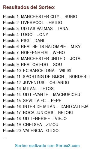 Lista de participantes: UD TENERIFE -- VIEJO, JUVENTUS -- ORLANDO, SPORTING DE GIJON -- BORDERLINE, LUGO -- JONY, REAL OVIEDO -- SOU, VALENCIA - GILXO, UD LEVANTE -- MACHUPICHU, BOCA JUNIORS -- BELOKI, MANCHESTER CITY -- RUBIO, MILAN -- LETOS, HOFFENHEIM -- WEBO, UD LAS PALMAS -- TANA, FC BARCELONA -- WILIKI, PSG -- DANI, REAL VALLADOLID -- VALDESS, BORUSIA DORTMUND -- ANTOÑIN, REAL BETIS BALOMPIE -- MIKY, SEVILLA FC -- PEPE, LIVERPOOL -- EMILIO, MANCHESTER UNITED -- JOTA, INTER DE MILAN -- DANI CALLEJA, CHELSEA – ZIZOU.