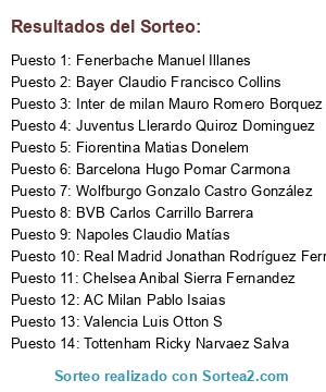 Lista de participantes: Juventus Llerardo Quiroz Dominguez, BVB Carlos Carrillo Barrera, Real Madrid Jonathan Rodríguez Ferreira, Inter de milan Mauro Romero Borquez, Napoles Claudio Matías, Barcelona Hugo Pomar Carmona, Chelsea Anibal Sierra Fernandez, AC Milan Pablo Isaias, Valencia Luis Otton S, Wolfburgo Gonzalo Castro González, Fiorentina Matias Donelem, Bayer Claudio Francisco Collins, Fenerbache Manuel Illanes, Tottenham Ricky Narvaez Salva.