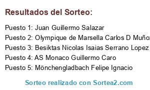 Lista de participantes: Mönchengladbach Felipe Ignacio, AS Monaco Guillermo Caro, Besiktas Nicolas Isaias Serrano Lopez, Olympique de Marsella Carlos D Muñoz, Juan Guillermo Salazar.