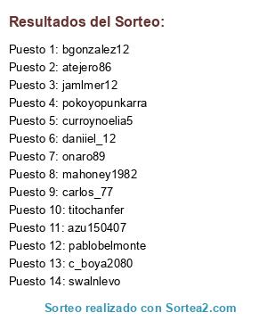 Lista de participantes: RUBEN10, ATEJERO, CHACON, JALMER, POKOYOPUNKARRRA, CURROYNOELIA, DANIIEL12, ONARO89, MAHONEY1982, TITOCHANFER, AZU, PABLOBELMONTON, SWANLEVO.