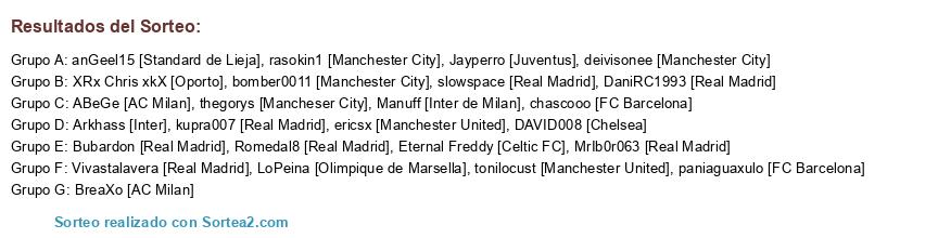 Lista de participantes: anGeel15 [Standard de Lieja], Jayperro [Juventus], chascooo [FC Barcelona], rasokin1 [Manchester City], ABeGe [AC Milan], deivisonee [Manchester City], paniaguaxulo [FC Barcelona], Vivastalavera [Real Madrid], kupra007 [Real Madrid], thegorys [Mancheser City], Romedal8 [Real Madrid], LoPeina [Olimpique de Marsella], bomber0011 [Manchester City], Bubardon [Real Madrid], DAVID008 [Chelsea], DaniRC1993 [Real Madrid], BreaXo [AC Milan], slowspace [Real Madrid], XRx Chris xkX [Oporto], MrIb0r063 [Real Madrid], Manuff [Inter de Milan], Eternal Freddy [Celtic FC], ericsx [Manchester United], tonilocust [Manchester United], Arkhass [Inter].