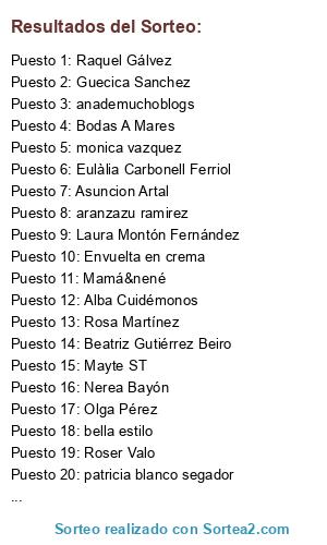 Lista de participantes: monica vazquez(5 participaciones), Nerea Bayón, anademuchoblogs(8 participaciones), Guecica Sanchez(8 participaciones), patricia blanco segador(4 participaciones), Clouds and Designs(7 participaciones), Alba Cuidémonos(6 participaciones), Asuncion Artal (7 participaciones), Beatriz Gutiérrez Beiro (4 participaciones), Mayte ST (3 participaciones), Laura Montón Fernández (8 participaciones), Roser Valo(5 participaciones), Mamá&nené(6 participaciones), Eulàlia Carbonell Ferriol (4 participaciones), Raquel Gálvez, bella estilo(3 participaciones), Rosa Martínez(5 participaciones), Mayte en la cocina(2 participaciones), Olga Pérez(3 participaciones), Alsago SG(7 participaciones), Envuelta en crema(7 participaciones), Victoria Herranz Majolero(3 participaciones), Bodas A Mares(7 participaciones), Lidia Baratas(8 participaciones), aranzazu ramirez(6 participaciones).