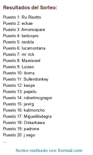 Lista de participantes: Oskarkawa, Luizao, ferminnn, eckae, padrone, sentenza, Miguelillodegra, robertmcgragor, kalimoncho, iborra, Ru Risotto, Proraiven, Sullendonkey, keops, Maxiisrael, Amonospare, ozora, angel el grande, j sego, mardom, osobla, javirg, rubencuervo, pepelu, cexar, lucamontana, beticopro, themoix, bustillo, mr rick, carmadayense, dukevillar.