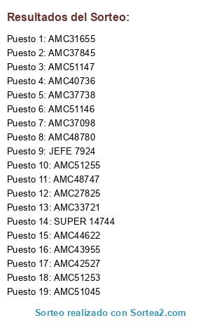 Lista de participantes: AMC27825 (18 participaciones), AMC31655 (12 participaciones), AMC33721 (24 participaciones), AMC37098 (6 participaciones), AMC37738 (35 participaciones), AMC37845 (15 participaciones), AMC40736 (15 participaciones), AMC42527 (33 participaciones), AMC43955 (15 participaciones), AMC44622 (20 participaciones), AMC48747 (26 participaciones), AMC48780 (14 participaciones), AMC51045 (9 participaciones), AMC51146 (11 participaciones), AMC51147 (29 participaciones), AMC51253 (13 participaciones), AMC51255 (33 participaciones), JEFE 7924 (14 participaciones), SUPER 14744 (13 participaciones), SUPER 14744.