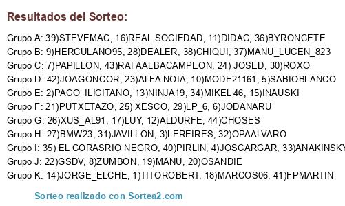 Lista de participantes: 1)TITOROBERT, 2)PACO_ILICITANO, 3)LEREIRES, 4)JOSCARGAR, 5)SABIOBLANCO, 6)JODANARU, 7)PAPILLON, 8)ZUMBON, 9)HERCULANO95, 10)MODE21161, 11)DIDAC, 12)ALDURFE, 13)NINJA19, 14)JORGE_ELCHE, 15)INAUSKI, 16)REAL SOCIEDAD, 17)LUY, 18)MARCOS06, 19)MANU, 20)OSANDIE, 21)PUTXETAZO, 22)GSDV, 23)ALFA NOIA, 24) JOSED, 25) XESCO, 26)XUS_AL91, 27)BMW23, 28)DEALER, 29)LP_6, 30)ROXO, 31)JAVILLON, 32)OPAALVARO, 33)ANAKINSKY WALKEE, 34)MIKEL 46, 35) EL CORASRIO NEGRO, 36)BYRONCETE, 37)MANU_LUCEN_823, 38)CHIQUI, 39)STEVEMAC, 40)PIRLIN, 41)FPMARTIN, 42)JOAGONCOR, 43)RAFAALBACAMPEON, 44)CHOSES.