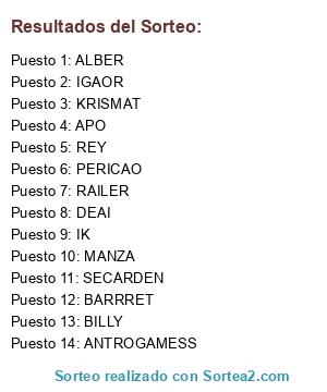 Lista de participantes: DEAI, RAILER, ANTROGAMESS, BARRRET, ALBER, KRISMAT, IGAOR, IK, BILLY, PERICAO, MANZA, REY, SECARDEN, APO.