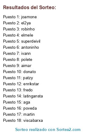 Lista de participantes: viscabarxa, donato, robinho, aga, patzy, enrikstar, joamone, poveda, el2ya, fredo, martin, polete, elmele, aimar, superdeivil, ivann, antoninho, latingansta.