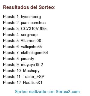 Lista de participantes: pinardy, serginorp, juanitoanchoa, CC731051995, NautilusX1, Altamont00, Machopy, vallejinho85, rikithelegend84, Traifor_ESP, hysemberg, muyayo19-2.
