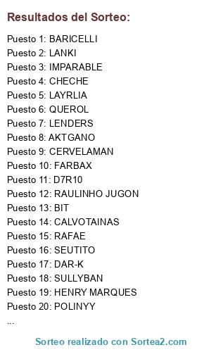 Lista de participantes: CHECHE, LENDERS, ADELVAL, POLINYY, FARBAX, RAULINHO JUGON, LANKI, HENRY MARQUES, SULLYBAN, MAKAROOV, BARICELLI, ITOGOL, IMPARABLE, D7R10, JOSE VALLECAS, KERO, AKTGANO, CERVELAMAN, LAYRLIA, SEUTITO, BIT, RAFAE, CALVOTAINAS, QUEROL, VLADI, DAR-K.