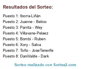 Lista de participantes: Juanne - Betico, Villavane-Pelaez, Parrita - Wey, Bombi - Ruben, Iborra-Liñán, Toño - JoseTenerife, Xory - Salva, DaniValde - Dark.