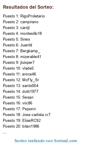 Lista de participantes: Bergkamp_, vlade5, McFly_Sr, mizerable41, borjals, bitan1986, saen3killer, viic86, montesillo18, Sesan, carrijl, RigoProletario, dutti1977, jluisper7, aroca46, Juanliti, santo004, Sinex, EliasRC92, Moi_cadi, Peponn, Jose cadista cr7, campirano, xxxMAXTERxxx.