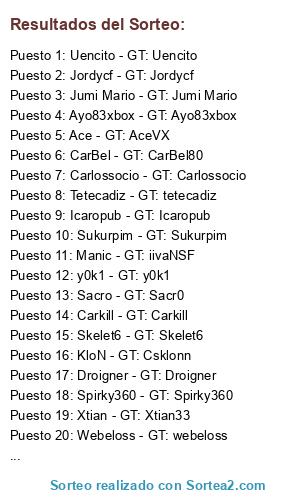 Lista de participantes: Sacro - GT: Sacr0, Celorios - GT: Celorios, Primito15 - GT: Primito15, Icaropub - GT: Icaropub, Ayo83xbox - GT: Ayo83xbox, Gabito09 - GT: gabito09, Sukurpim - GT: Sukurpim, Droigner - GT: Droigner, CarBel - GT: CarBel80, Calmpepe - GT: Calmpepe, Marcosrg - GT: marcosrg, Carkill - GT: Carkill, EVL JJcrack10 - GT: EVL JJcrack10, Jordycf - GT: Jordycf, KloN - GT: Csklonn, Xtian - GT: Xtian33, Uencito - GT: Uencito, Nesjai - GT: NESJAI, TATO XD - GT: TATO XD, Rakaldas - GT: Rakaldas, Duc - GT: Duc90, Jumi Mario - GT: Jumi Mario, Spirky360 - GT: Spirky360, Manic - GT: iivaNSF, Webeloss - GT: webeloss, Carlossocio - GT: Carlossocio, Skelet6 - GT: Skelet6, Ace - GT: AceVX, Duqmora - GT: El gran duque, Tetecadiz - GT: tetecadiz, y0k1 - GT: y0k1, Bart026 - GT: Badget.