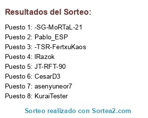 Lista de participantes: -SG-MoRTaL-21, CesarD3, asenyuneor7, Pablo_ESP, KuraiTester, -TSR-FertxuKaos, JT-RFT-90, lRazok.