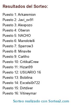 Lista de participantes: Carliho, Minavite, NACHO, Dirtdiver, Alexpozo, Hizan99, Vitineymar, Manolotelli, CritikalCrew, Arkaremion, Sparrow3, Javi_ov91, Excelsi0r722, Bobilina, Oberon, USUARIO 16.