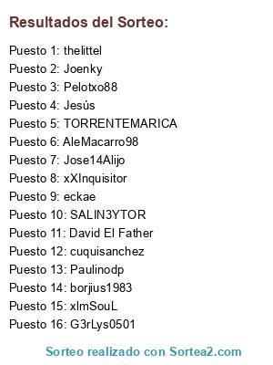 Lista de participantes: eckae, Pelotxo88, xXInquisitor, Jose14Alijo, xlmSouL, thelittel, Joenky, SALIN3YTOR, borjius1983, David El Father, cuquisanchez, Paulinodp, AleMacarro98, TORRENTEMARICA, G3rLys0501, Jesús.