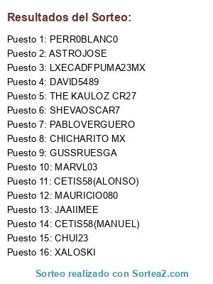 Lista de participantes: SHEVAOSCAR7, CETIS58(MANUEL), DAVID5489, JAAIIMEE, XALOSKI, CHICHARITO MX, MARVL03, PABLOVERGUERO, CHUI23, PERR0BLANC0, ASTROJOSE, GUSSRUESGA, CETIS58(ALONSO), LXECADFPUMA23MX, THE KAULOZ CR27, MAURICIO080.