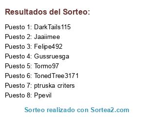 Lista de participantes: ptruska criters, DarkTails115, Tormo97, Felipe492, TonedTree3171, Jaaiimee, Gussruesga, Ppevil.