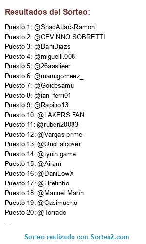 Lista de participantes: @miguelll.008, @gabiotax42, @26aasiieer, @ShaqAttackRamon, @manugomeez_, @evaristo fantasy king, @thecarl00s, @Goidesamu, @fakeadri23, @tyuin game, @DaniLowX, @ian_ferri01, @jezuelmoreno, @8ProPro8, @LAKERS FAN, @Sl_19_, @ivanfrp12, @DaniDiazs, @jesussxgura, @Casimuerto, @Torrado, @Llretinho, @Rapiho13, @Vargas prime, @CEVINNO SOBRETTI, @Manuel Marín, @ruben20083, @Airam, @Oriol alcover.