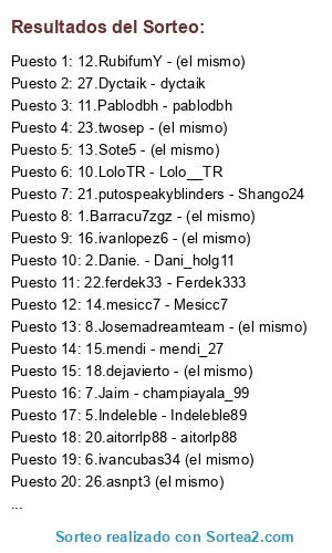 Lista de participantes: 1.Barracu7zgz - (el mismo), 2.Danie. - Dani_holg11, 3.DSerrano-12 - (el mismo), 4.Tejero - Gaznate8, 5.Indeleble - Indeleble89, 6.ivancubas34 (el mismo), 7.Jaim - champiayala_99, 8.Josemadreamteam - (el mismo), 9.Lewis - Marc5anna, 10.LoloTR - Lolo__TR, 11.Pablodbh - pablodbh, 12.RubifumY - (el mismo), 13.Sote5 - (el mismo), 14.mesicc7 - Mesicc7, 15.mendi - mendi_27, 16.ivanlopez6 - (el mismo), 17. wolverine_rms - (el mismo), 18.dejavierto - (el mismo), 19.josevs93 - (el mismo), 20.aitorrlp88 - aitorlp88, 21.putospeakyblinders - Shango24, 22.ferdek33 - Ferdek333, 23.twosep - (el mismo), 24.capitanno86 - (el mismo), 25.Iván - ivanpirlo, 26.asnpt3 (el mismo), 27.Dyctaik - dyctaik, 28.torets - Torets55.