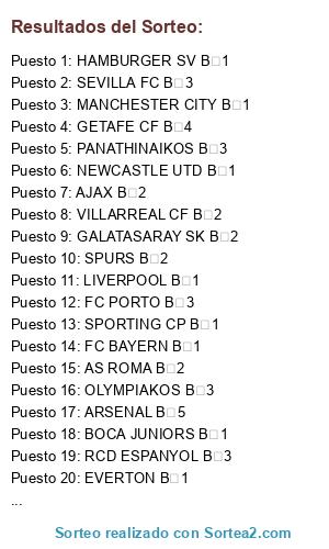 Lista de participantes: FC BAYERN B 1, VALENCIA CF B 4, OLYMPIAKOS B 3, PSG B 3, RCD ESPANYOL B 3, FIORENTINA B 2, MALAGA CF B 3, OLYMPIQUE LYON B 3, UDINESE B 3, LIVERPOOL B 1, PANATHINAIKOS B 3, SPURS B 2, AJAX B 2, SEVILLA FC B 3, SAMPDORIA B 1, FC BARCELONA B 1, BOCA JUNIORS B 1, GETAFE CF B 4, MANCHESTER CITY B 1, AS ROMA B 2, SPORTING CP B 1, GALATASARAY SK B 2, VILLARREAL CF B 2, FC PORTO B 3, ARSENAL B 5, HAMBURGER SV B 1, EVERTON B 1, NEWCASTLE UTD B 1.