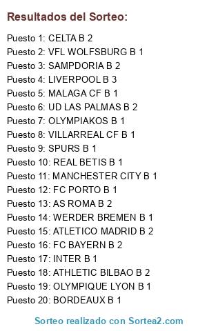 Lista de participantes: FC PORTO B 1, UD LAS PALMAS B 2, ATLETICO MADRID B 2, FC BAYERN B 2, BORDEAUX B 1, VILLARREAL CF B 1, CELTA B 2, ATHLETIC BILBAO B 2, AS ROMA B 2, INTER B 1, MALAGA CF B 1, MANCHESTER CITY B 1, REAL BETIS B 1, SAMPDORIA B 2, WERDER BREMEN B 1, OLYMPIAKOS B 1, LIVERPOOL B 3, OLYMPIQUE LYON B 1, SPURS B 1, VFL WOLFSBURG B 1.
