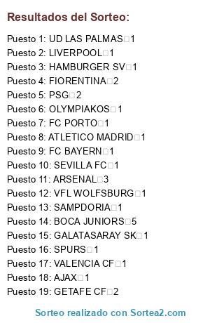 Lista de participantes: GALATASARAY SK 1, PSG 2, FC BAYERN 1, UD LAS PALMAS 1, SAMPDORIA 1, SEVILLA FC 1, VALENCIA CF 1, ATLETICO MADRID 1, AJAX 1, OLYMPIAKOS 1, SPURS 1, ARSENAL 3, FIORENTINA 2, FC PORTO 1, GETAFE CF 2, BOCA JUNIORS 5, HAMBURGER SV 1, VFL WOLFSBURG 1, LIVERPOOL 1.