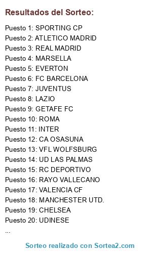 Lista de participantes: FC BARCELONA, LIVERPOOL, UD LAS PALMAS, RAYO VALLECANO, MANCHESTER UTD., SPORTING CP, B. LEVERKUSEN, SAMPDORIA, SCHALKE 04, VFL WOLFSBURG, OLYMPIAKOS, GETAFE FC, CHELSEA, MARSELLA, UDINESE, RC DEPORTIVO, BORDEAUX, PSG, INTER, EVERTON, ATLETICO MADRID, RCD ESPANYOL, CA OSASUNA, JUVENTUS, LAZIO, REAL MADRID, ROMA, VALENCIA CF, BOCA JUNIORS.