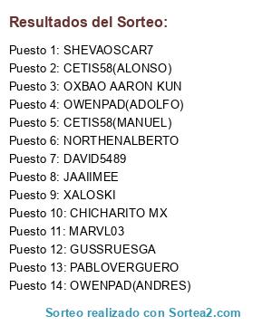 Lista de participantes: CETIS58(MANUEL), CETIS58(ALONSO), CHICHARITO MX, DAVID5489, GUSSRUESGA, JAAIIMEE, MARVL03, NORTHENALBERTO, OXBAO AARON KUN, OWENPAD(ANDRES), OWENPAD(ADOLFO), PABLOVERGUERO, SHEVAOSCAR7, XALOSKI.