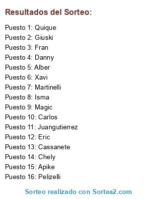 Lista de participantes: Pelizelli, Apike, Cassanete, Magic, Juangutierrez, Isma, Xavi, Eric, Fran, Carlos, Chely, Martinelli, Danny, Quique, Alber, Giuski.