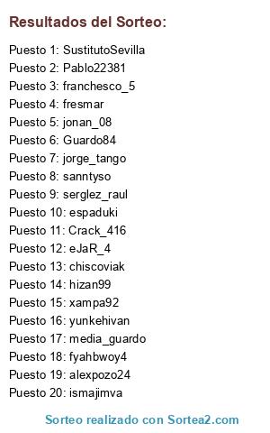 Lista de participantes: media_guardo, eJaR_4, xampa92, franchesco_5, yunkehivan, Pablo22381, fyahbwoy4, jonan_08, hizan99, Guardo84, sanntyso, serglez_raul, fresmar, espaduki, alexpozo24, ismajimva, Crack_416, chiscoviak, jorge_tango, SustitutoSevilla.