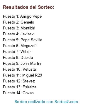 Lista de participantes: Vetusta, Gemelo, Wittor, Montibiri, Miguel R29, John Martin, Megazoft, Pepe Sevilla, Stevez, Eskalza, Javisev, Covas, Dubidu, Amigo Pepe.