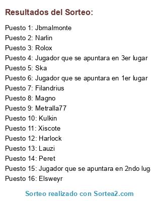 Lista de participantes: Harlock, Rolox, Elsweyr, Lauzi, Xiscote, Peret, Magno, Ska, Metralla77, Jbmalmonte, Kulkin, Narlin, Filandrius, Jugador que se apuntara en 1er lugar, Jugador que se apuntara en 2ndo lugar, Jugador que se apuntara en 3er lugar.