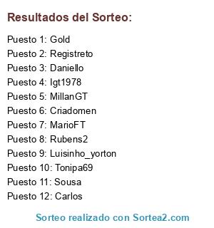 Lista de participantes: Igt1978, Luisinho_yorton, Sousa, Criadomen, Registreto, Rubens2, MillanGT, Gold, MarioFT, Daniello, Carlos, Tonipa69.