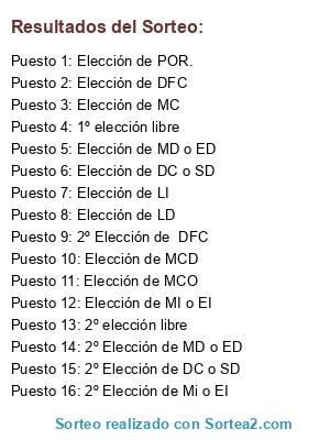 Lista de participantes: Elección de POR., Elección de LD, Elección de LI, Elección de DFC, 2º Elección de DFC, Elección de MC, Elección de MCD, Elección de MCO, Elección de MI o EI, Elección de MD o ED, 2º Elección de Mi o EI, 2º Elección de MD o ED, Elección de DC o SD, 2º Elección de DC o SD, 1º elección libre, 2º elección libre.