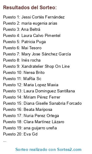Lista de participantes: Laura Dominguez Santillana (2 participaciones), Cristina Castaño González (3 participaciones), MaRia Sc (3 participaciones), Maite Fdez (2 participaciones), Chris Hana (2 participaciones), Mai Tesoro (2 participaciones), Mary Jose Sánchez García (2 participaciones), anit fg (2 participaciones), Mapy Mapycall (2 participaciones), Yany G. Carrillo (Nyreich), Ana Beltrá, Elena de Antonio (2 participaciones), Marta Barquín Muñoz, Sandra Motta (2 participaciones), Beata Mariposa (2 participaciones), tamara henriquez Blanco, paula nave (2 participaciones), Susana Pinos Hernández (2 participaciones), neussina (3 participaciones), Manuela Martín Parrondo (2 participaciones), susana beltran (2 participaciones), Albita Bierzo (2 participaciones), Gemma Hidalgo (2 participaciones), ana guijarro ureña (2 participaciones), Nerea González Cortina, Nerea Brito (2 participaciones), Indira Rodriguez (2 participaciones), Inés rocha, Clara Martínez Lázaro (2 participaciones), Xandratelier Shop On Line (3 participaciones), Laura Calvo Pimentel, nenita nenah (2 participaciones), Marisa Márquez Pérez (2 participaciones), Ana Vazquez (3 participaciones), mariposilla potinguera (2 participaciones), Cristina Rodríguez (2 participaciones), Maria Lopez Maxia (3 participaciones), maria eugenia arias (2 participaciones), chelo moa (3 participaciones), MariaRosa Fdz, Diana Giselle Sanabria Forcado (2 participaciones), sofia esther ruiz garcia, Miriam Pérez Ferrer (2 participaciones), Elena Mesa (2 participaciones), Nuria Gar. Bue, imma le, Mallirubi (2 participaciones), maria lopez iglesias (2 participaciones), Eva Gd (2 participaciones), Paqui Risquez (2 participaciones), Concursos Sorteos Regalos, RocioPotisYcositas (2 participaciones), Ana Morea, Jessi Cortés Fernández (2 participaciones), Roxana Gonzalez (2 participaciones), Nuria Perez Ortega (2 participaciones), Patricia Puga (2 participaciones), Bien Bienmesabe , Bien Bienmesabe.