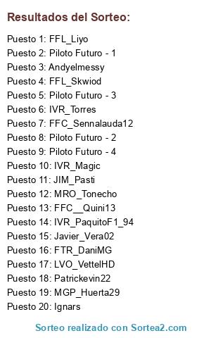 Lista de participantes: IVR_PaquitoF1_94, Javier_Vera02, Andyelmessy, IVR_Magic, FFC__Quini13, IVR_Torres, Patrickevin22, MRO_Tonecho, Ignars, FTR_DaniMG, MGP_Huerta29, FFL_Liyo, FFL_Skwiod, JIM_Pasti, LVO_VettelHD, FFC_Sennalauda12, Piloto Futuro - 1, Piloto Futuro - 2, Piloto Futuro - 3, Piloto Futuro - 4.