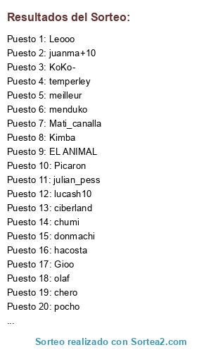Lista de participantes: lean_Escalada, el28NoB, wally, Picaron, bocademivida, ciberland, Kimba, DaNii, Marcos-Bostero, Aguante Banfield, Bocampeon, Gioo, meilleur, hacosta, Matrix+10, AgusCuervo, donmachi, menduko, Lucas.B, W@LT3R, juanma+10, matias19, Guille7, Bosterox100pre, seti_bolso, defensayjusticia, waki10, KoKo-, Tony_+10, LEPRACAPOMZA, temperley, tomatute, Leooo, lucash10, chumi, azul_francia, MR PRESIDENT, chero, EL ANIMAL, pocho, julian_pess, alextucu, ezequiel_rosario_nob, mack695, elloco, Independiente_fc, FedeAKD, juako, Nikoo, ***CNdeF[Mauro], Mateito, Guiidoleproso, SeSeCOLON_93, Mati_canalla, Tamarindo, Matyazpity, maxi648, Hamilton_Ricard, ezev123, RodriAKD, emilianob12, Molito, Alex, Joga+10, Magic_Rosicky, EbeR, Maschiikiito!, olaf, Mathee, mellu, sad_audio, GaPa.