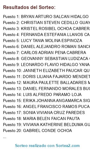 Lista de participantes: ANGEL FRANCISCO RAMOS PUCA, DANIEL EDUARDO COELLO CARVALLO, ERIKA JOHANNA ANGAMARCA SIGUENCIA, BISMARCK NEY RAMIREZ GALLARDO, CHRISTIAN STEVEN CEDILLO GUAYANAY, DANIEL ALEJANDRO ROMAN SANCHEZ, DANIEL FERNANDO MORALES BUCHELI, EVELYN THAYNI LOJA JIMENEZ, FERNANDA ESTEFANIA LLANOS CARACONDO, FREDDY JOSUE TAPIA BENAVIDES, GABRIEL CONDE OCHOA, INGRID MICHELLE GUIRACOCHA VINANZACA, JANNETH ELIZABETH PAUCAR QUITO, KEYLA JAZMINA JAYA HUACHICHULLCA, KRISTEL ROSIBEL OCHOA CABRERA, LUCY TANIA MOLINA ESPINOZA, MARJORIE JANINA ALVARADO LUCERO, MATEO NICOLAS PERALTA MORENO, SEBASTIAN MATIAS MORALES LEON, SONIA VIVIANA CRUZ PAREDES, VIVIANA KATHERINE BELDUMA GUAMBANA, BRYAN ARTURO SALCAN HIDALGO, CARLOS ADRIAN PENA CABRERA, DORIS LILIANA FAJARDO MENDIETA, GEOVANNY SEBASTIAN LUDIZACA GUARTAN, JHOSELYN GUADALUPE VANEGAS PENALOSA, JORDY JOSUE CALDERON SOSA, JORGE ANDRES BASTIDAS CARDENAS, JORGE EDUARDO LABANDA SIGCHO, JOSUE ISMAEL CAJAMARCA ORTEGA, JUAN CARLOS ZUNA LEON, LEONARDO FLAVIO HIDALGO YANANGOMEZ, LUIS ALFREDO PARAMO LOJA, LUIS FERNANDO TADAY BERMEO, MARIA BELEN FAICAN PAUTA, MAURA PAULETTE BALLADARES MINAN, MONICA DANIELA QUINCHE GUAZHAMBO, STALIN PATRICIO BELTRAN ORTEGA.